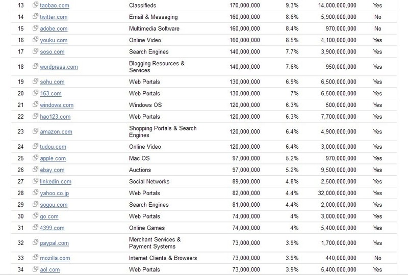 Google正式更新了全球排名前100名的網站排行版信息,國內百度擠入第8名,獨立訪問量3.1億,QQ排名第10名,獨立訪問是 2.5億,Facebook穩坐名獨立訪問量為8.7億,58同城上升到在第78位,姚建波在微博表示,爭取今年進入全球前58名,相信對于國內90%的站長來說還是個夢,繼續努力。